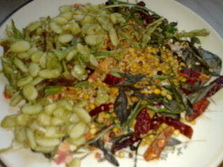 This is an other variety of Thuvaiyal, I make with Vegetable peels like Ridge Gourd Peel & Chow- chow peel. I also make chutney & pachadi out of inner pith of tender Snake gourd. The picture below shows Ridge Gourd peel and the inner pith taken out of Snake Gourd, I mixed both of them and made this chutney